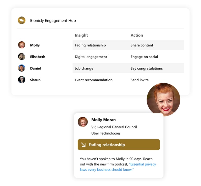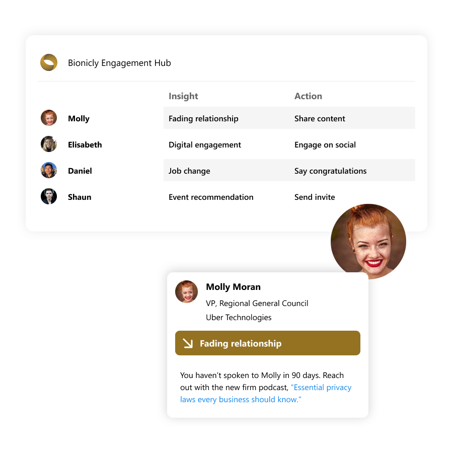 Bionicly isn’t another analytics tool – it’s a new standard for data-driven decision making. Every insight is delivered with a suggested action that’s individually tailored and goal-aligned. Bionicly makes it easy to re-engage a fading relationship, share an article with a key prospect, or stay top-of-mind with your most valuable contacts.